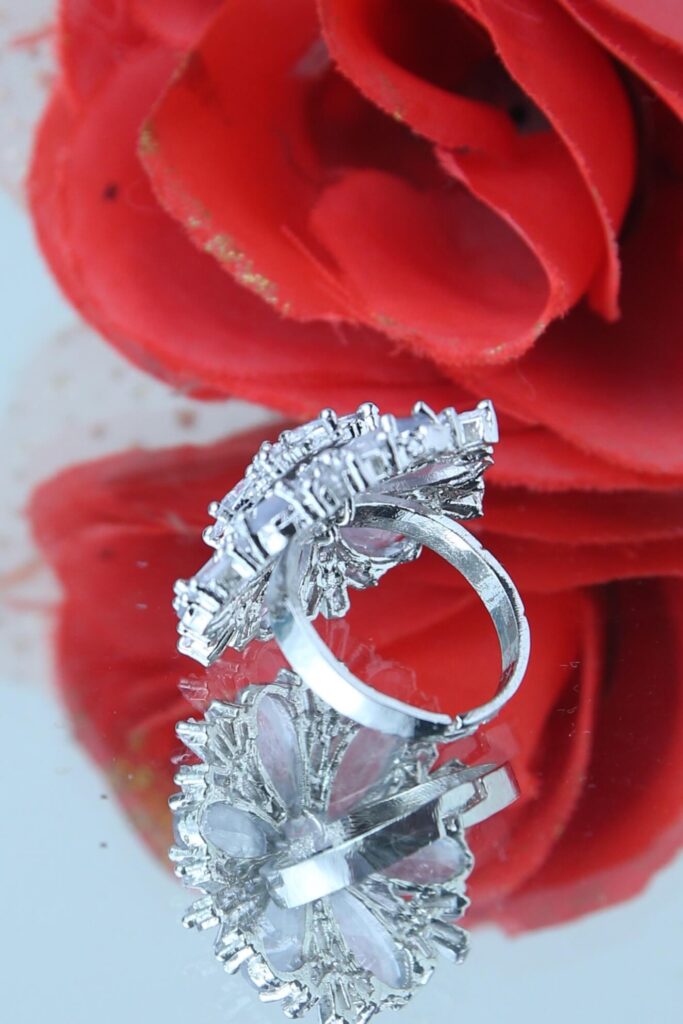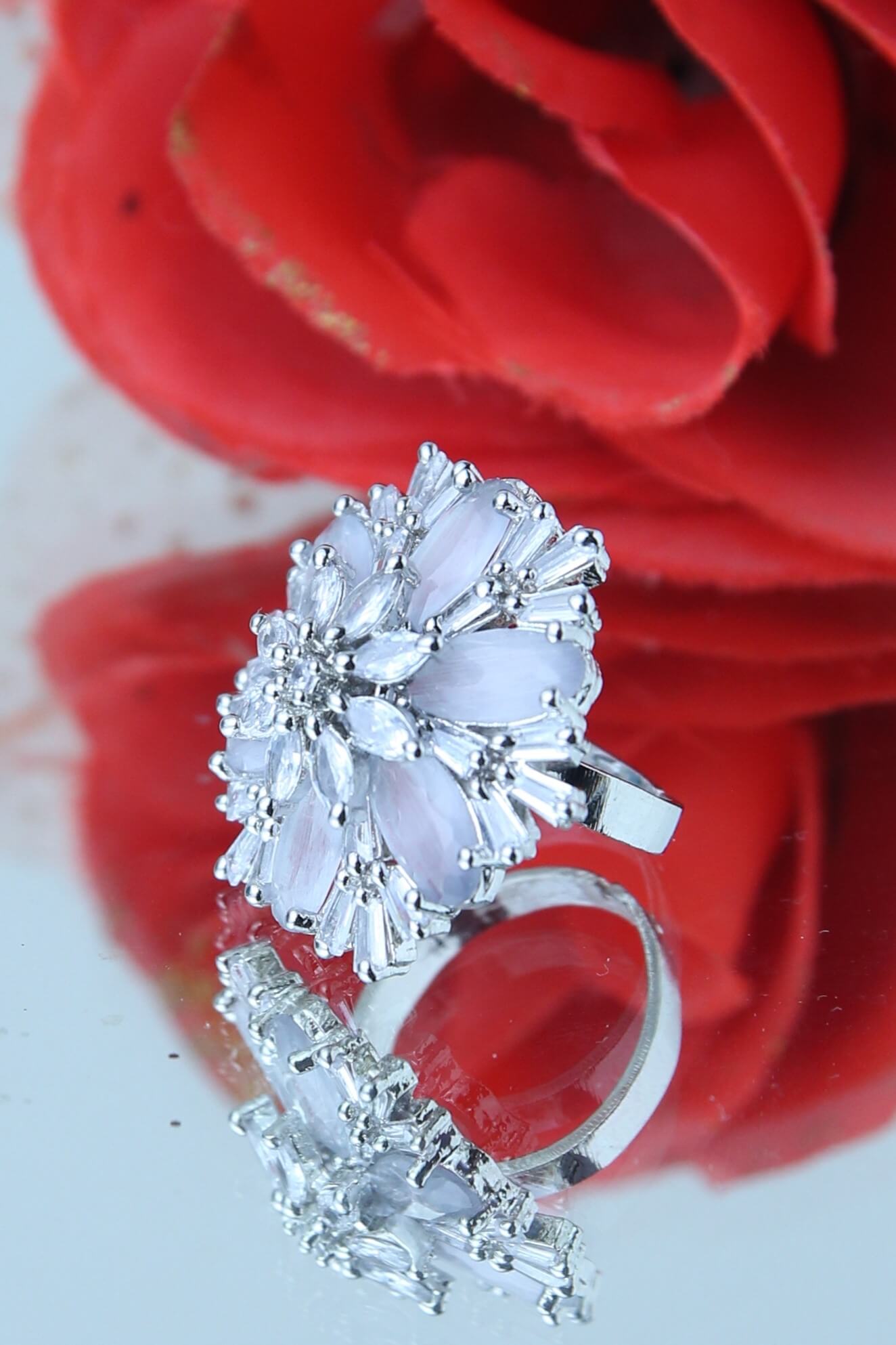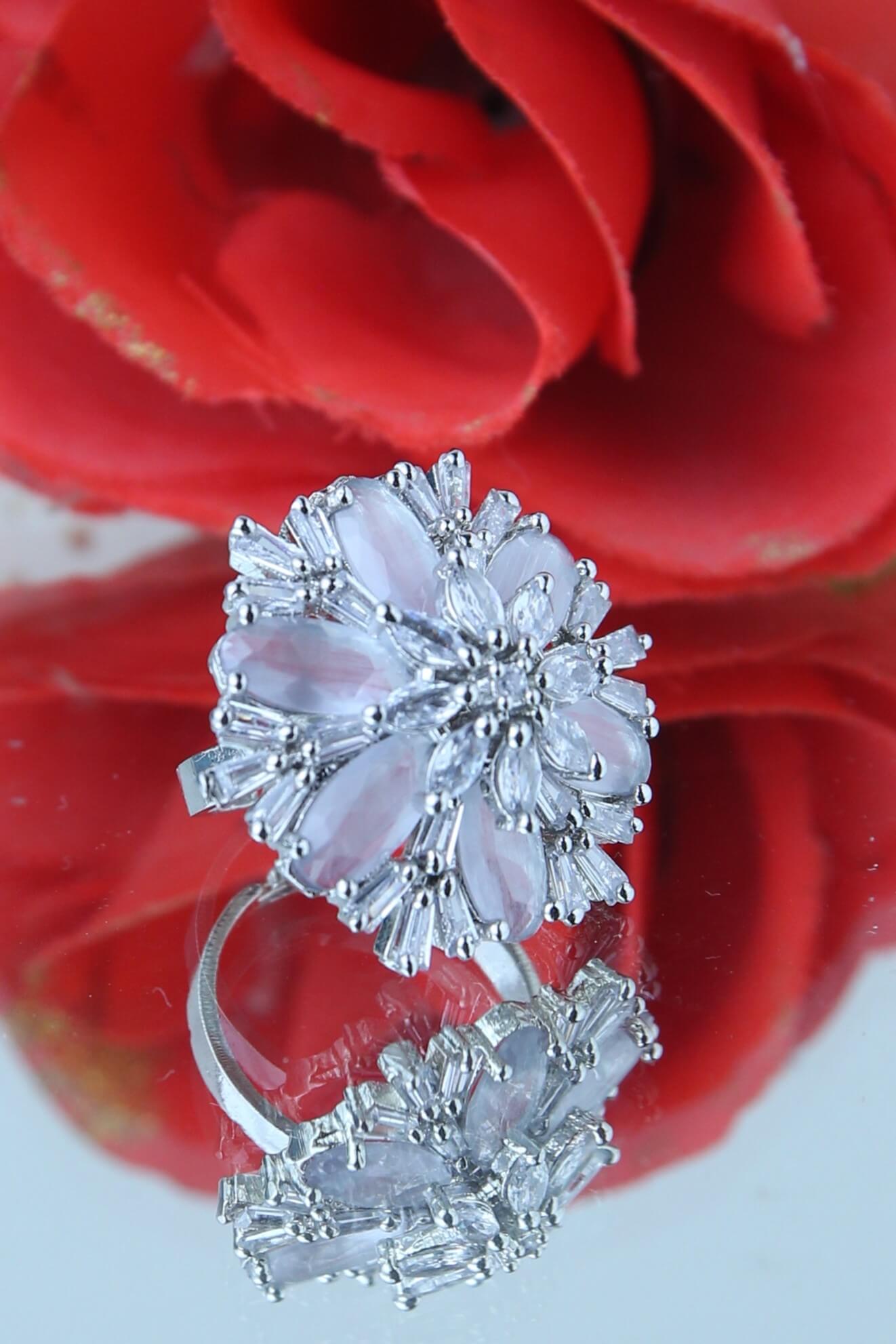 Indulge in elegance with this white gemstone cluster ring, which is made to catch light from all directions, you may indulge in the ultimate in elegance. Crafted with precision, these rings feature a stunning flower-inspired design, intricately set with sparkling zircon stones and soft pink gemstones that radiate elegance. This ring radiates elegance and grandeur whether it is worn for formal occasions, weddings, or engagements. ($40.00)