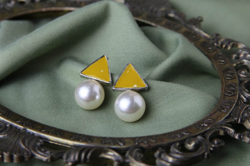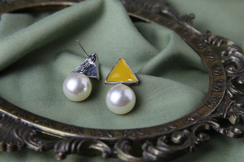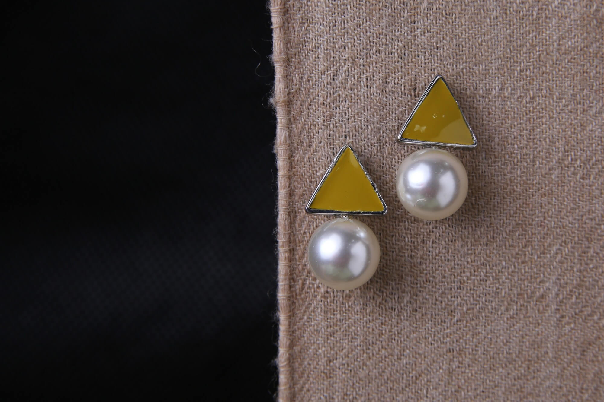 These contemporary earrings combine yellow triangular enamel tops with lustrous pearl drops. The bright yellow triangles provide a pop of color, while the white pearls add classic elegance. Set in silver, the geometric top contrasts beautifully with the organic shape of the pearls. Their unique design balances modern and traditional elements.